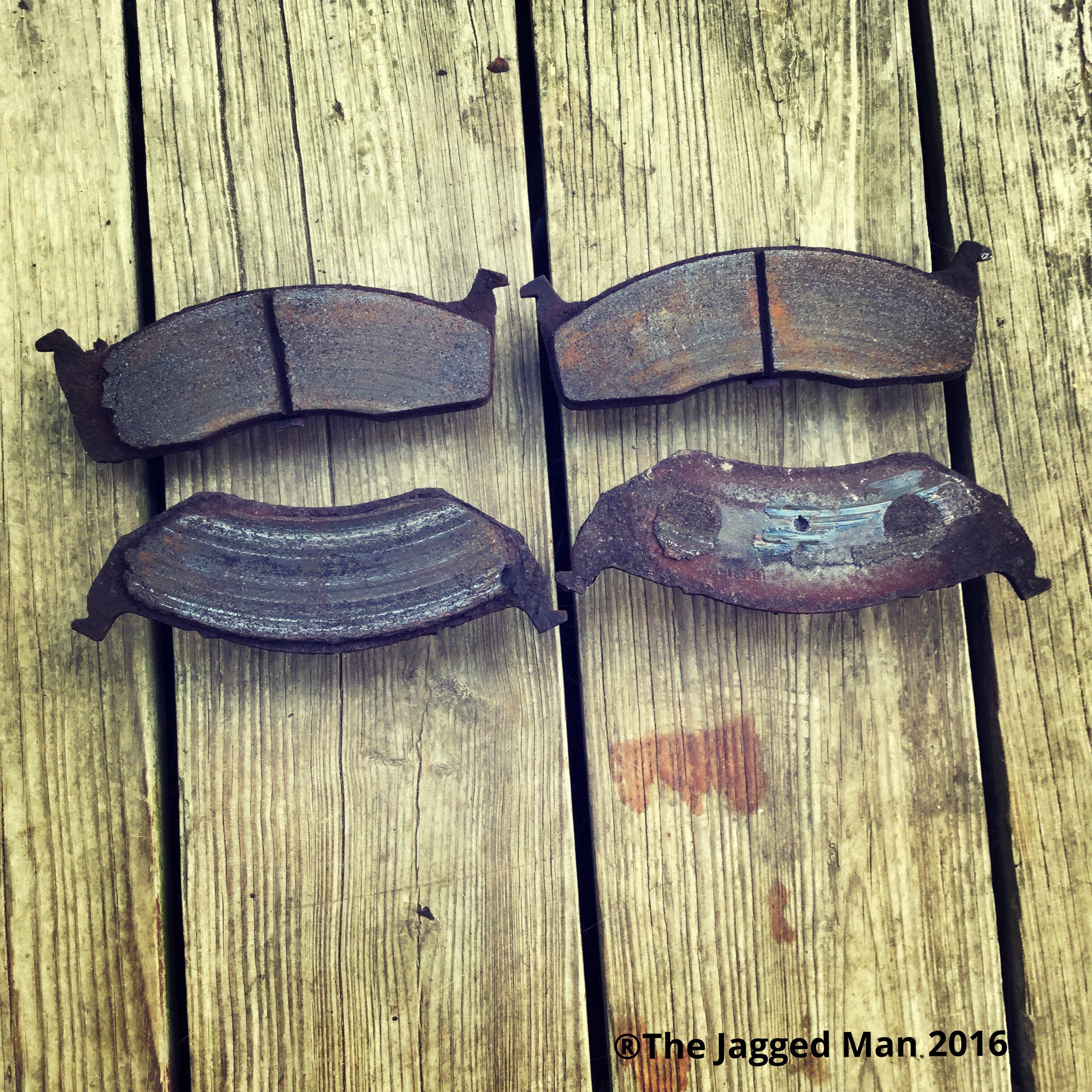 Now I telling you this because even in changing brakes and rotors The Jagged Man can learn life lessons. The first lesson I framed was after inspecting the front pads: Something is missing but what can I learn from that? When your car, or you, is not maintained things do not work as they should. I need to get control of my eating habits so maybe I should do something about before lesson two comes into play.